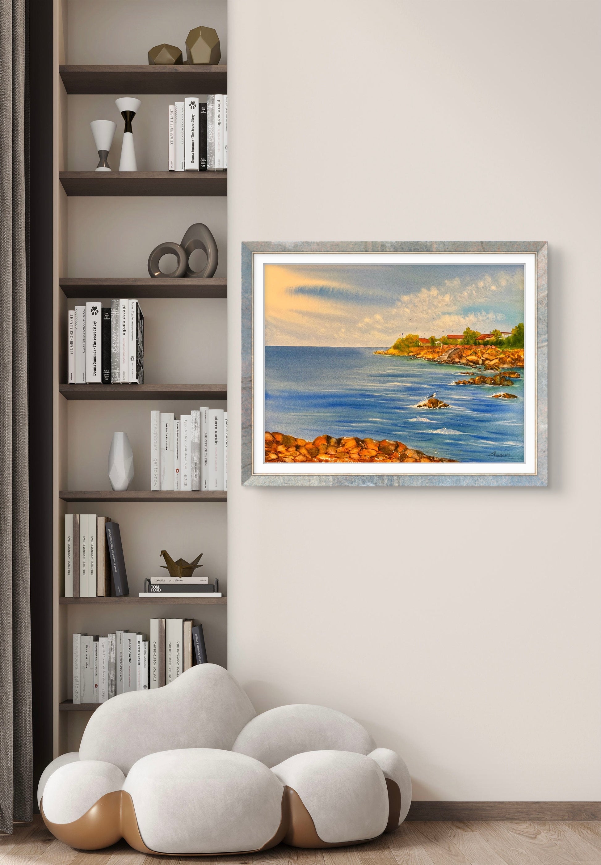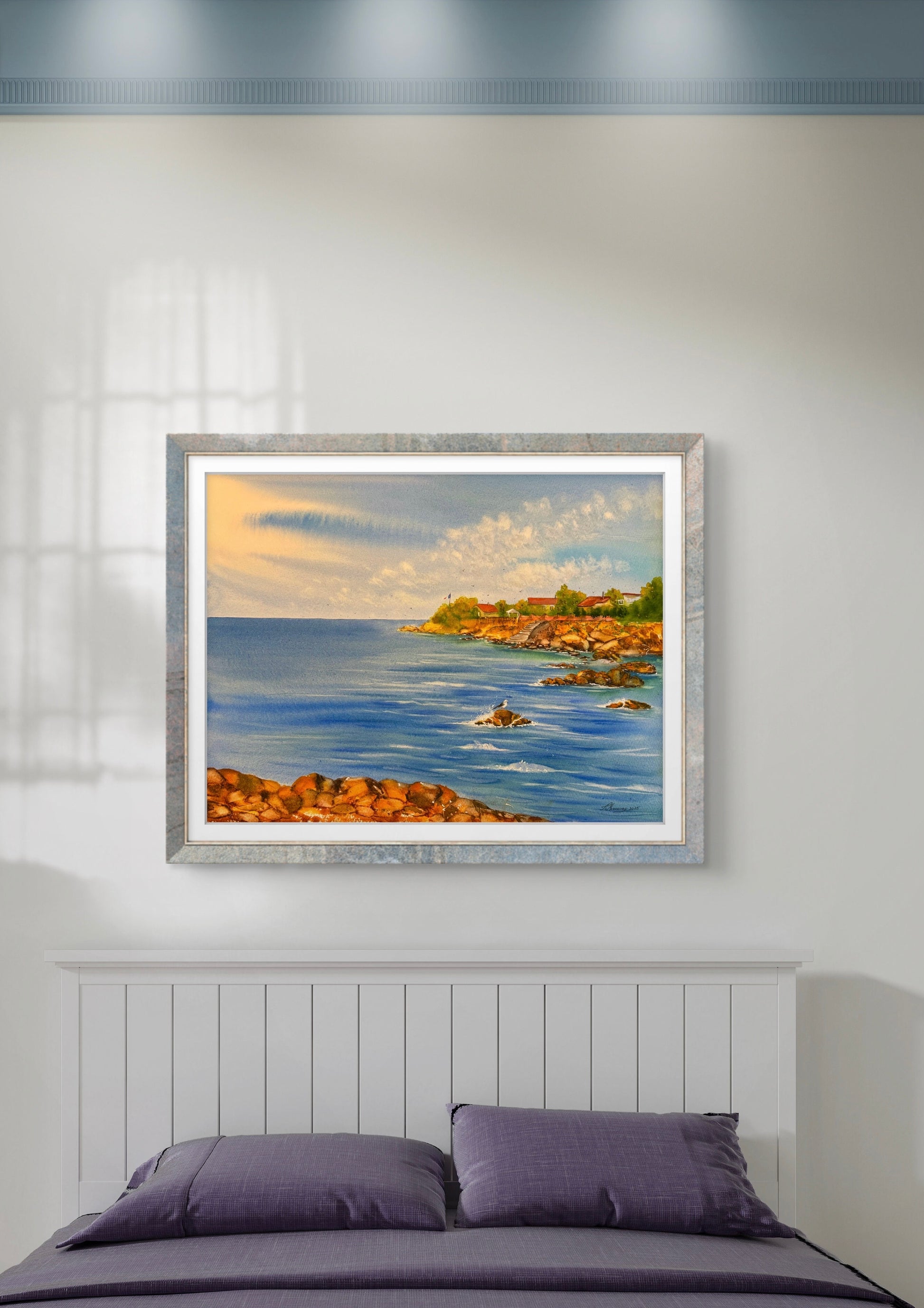A luminous watercolor where the coastline of Anthéor unfolds in tranquil harmony — the sea merging with the horizon, the sunlight gently tracing the rocks.