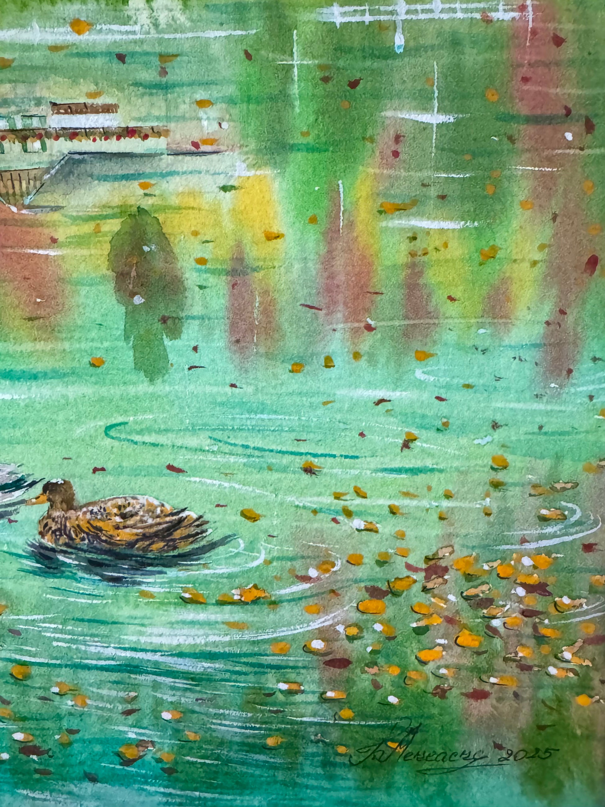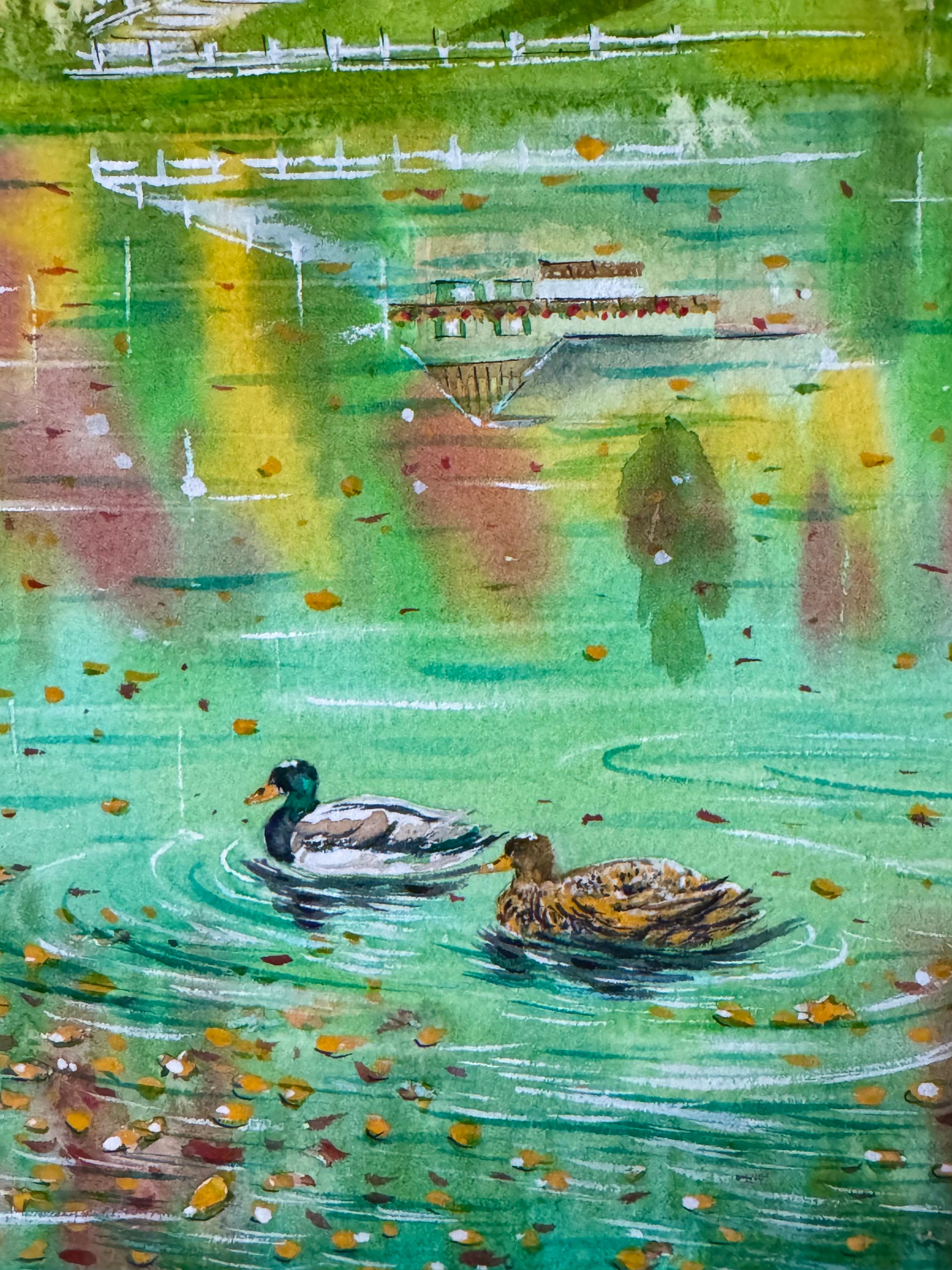 A soft autumn light falls over drifting leaves, ducks gliding near the forest edge, and a house reflected in the gentle ripples.